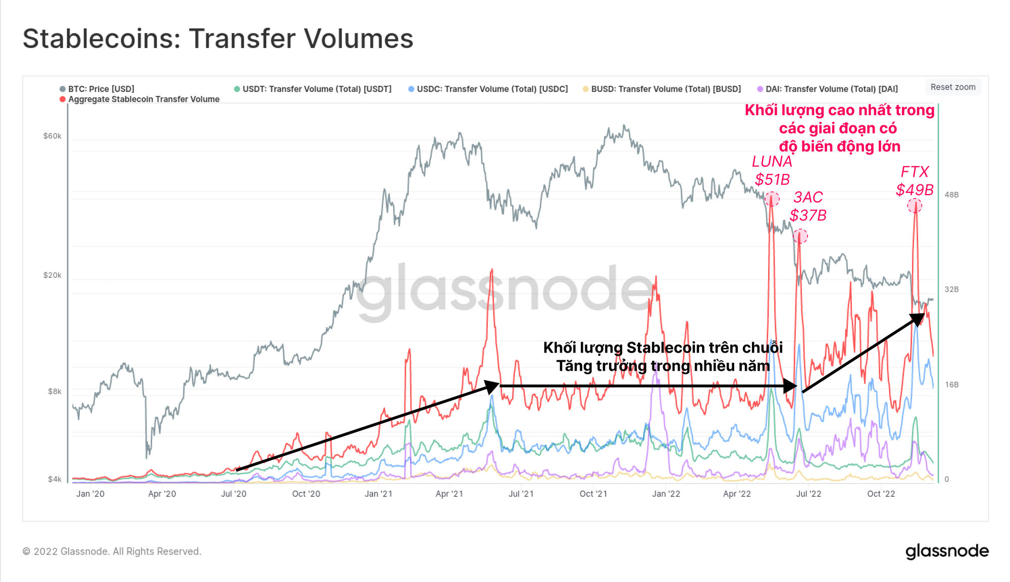 Trong các sự kiện bán tháo có tính biến động cao vào tháng 5, tháng 6 và tháng 11, tổng khối lượng chuyển stablecoin đạt đỉnh trong khoảng từ 37 tỷ USD đến 51 tỷ USD, cho thấy nhu cầu cực lớn đối với tính thanh khoản USD trong các sự kiện thanh lý.