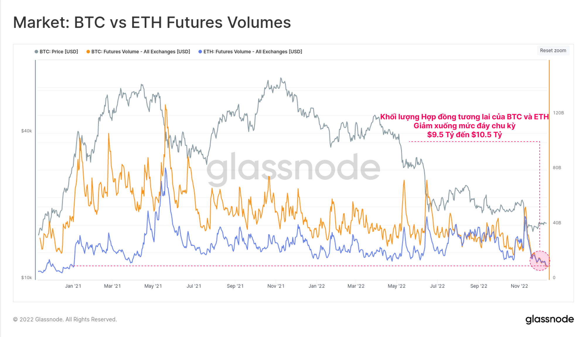 Khối lượng hợp đồng tương lai cũng giảm tương tự, hiện đang ở mức thấp nhất trong nhiều năm. Cả BTC và ETH đang được giao dịch với khối lượng tương đương trong khoảng từ 9.5 tỷ đô đến 10.5 tỷ đô mỗi ngày. Điều này cho thấy tác động to lớn của việc thắt chặt thanh khoản, giảm đòn bẩy trên diện rộng và sự suy yếu của nhiều tổ chức cho vay và giao dịch trong không gian Crypto.