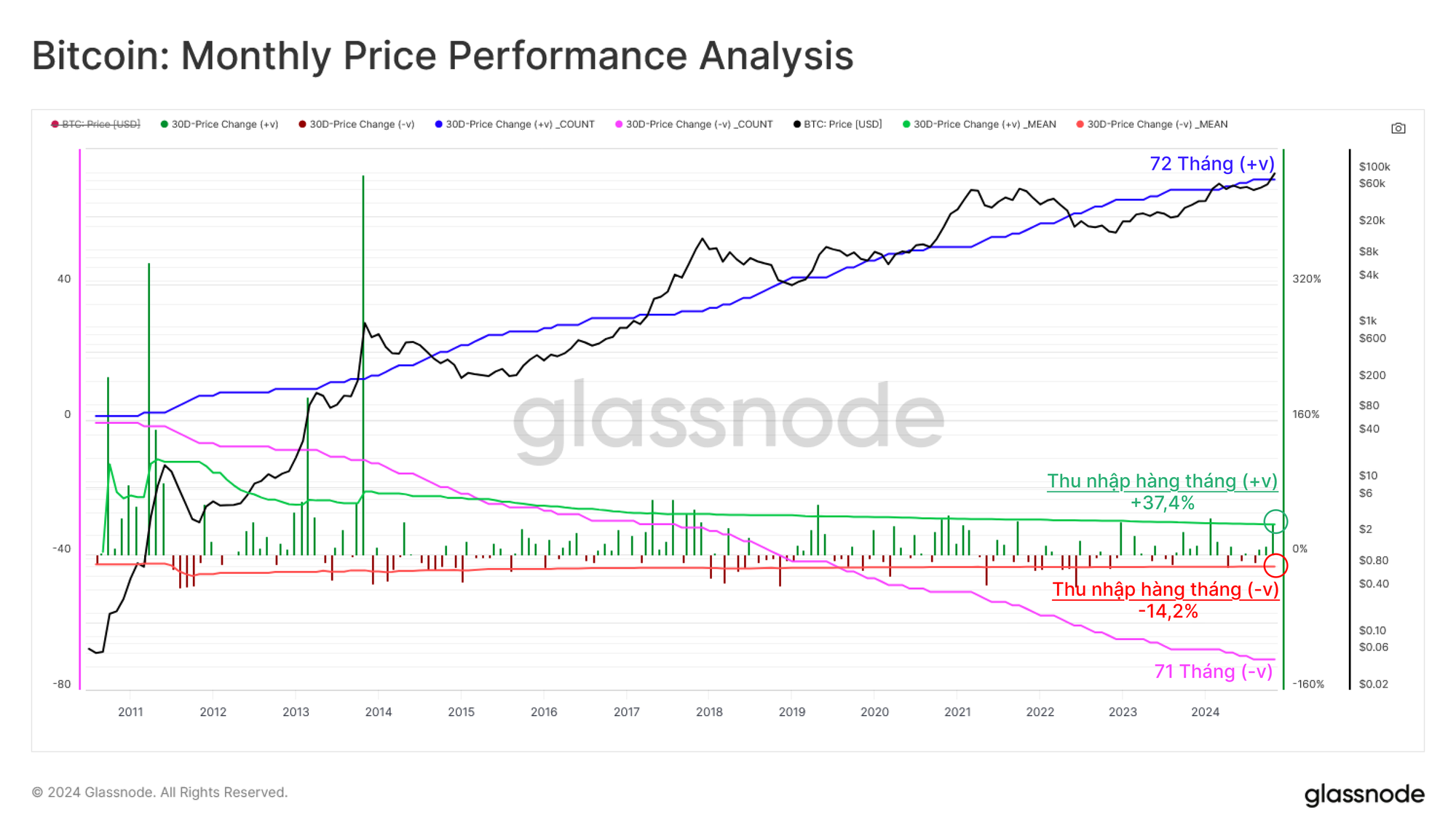 Bitcoin đã có giá giao dịch tích cực trong 5.256 ngày và đã tăng trưởng từ một phần nhỏ của một xu lên $100k. Hành trình này bao gồm 72 nến tháng tăng (bao gồm tháng 12 năm 2024), với mức tăng trung bình là +37,4% và 71 nến tháng giảm, với mức trung bình là -14,2%.