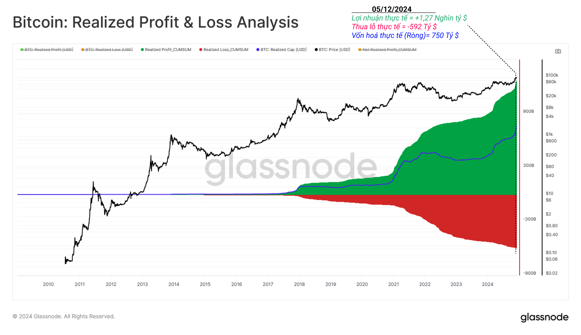 Trong suốt giai đoạn mở rộng thị trường đáng kinh ngạc này, các nhà đầu tư đã thu được tổng cộng 1,27 nghìn tỷ USD lợi nhuận và -592 tỷ USD thua lỗ on-chain (dựa trên chênh lệch giữa giá mua và giá bán). Điều này dẫn đến dòng vốn tích lũy ròng (Vốn hóa thực tế) là 750 tỷ USD và nhấn mạnh giá trị khổng lồ đã chảy vào mạng lưới Bitcoin trong suốt lịch sử của nó.