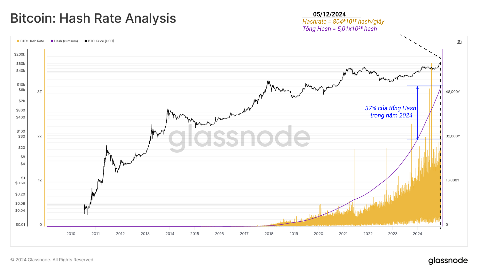 Hashrate mạng đã tăng vọt từ 128.185 hash/giây lên hơn 804.407.834.059.443.100.000 hash/giây vào thời điểm Bitcoin đạt $100k. Tính đến nay, thợ đào đã tính toán được khoảng 5,01 x 1028 hash. Đáng chú ý là 37% tổng số hash được tính toán đã xảy ra trong suốt năm 2024.