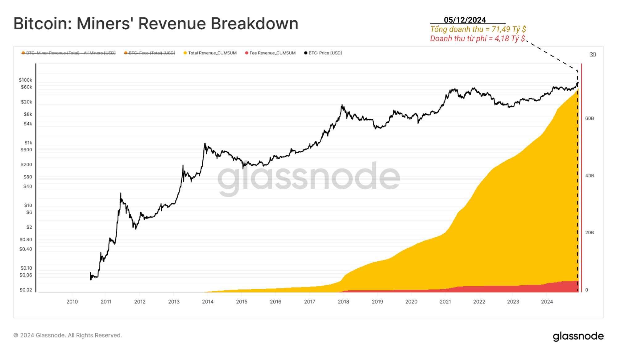 Tính đến ngày 05 tháng 12, thợ đào đã kiếm được tổng cộng 71,49 tỷ USD cho những nỗ lực tính toán của họ, với phần thưởng khối được định giá vào ngày khối được khai thác. Doanh thu này bao gồm 67,31 tỷ USD tiền thưởng từ việc xác nhận khối mới và 4,18 tỷ USD phí giao dịch do người dùng trả. Con số này chỉ chiếm 3,57% trong mức vốn hóa thị trường 2 nghìn tỷ USD của Bitcoin.