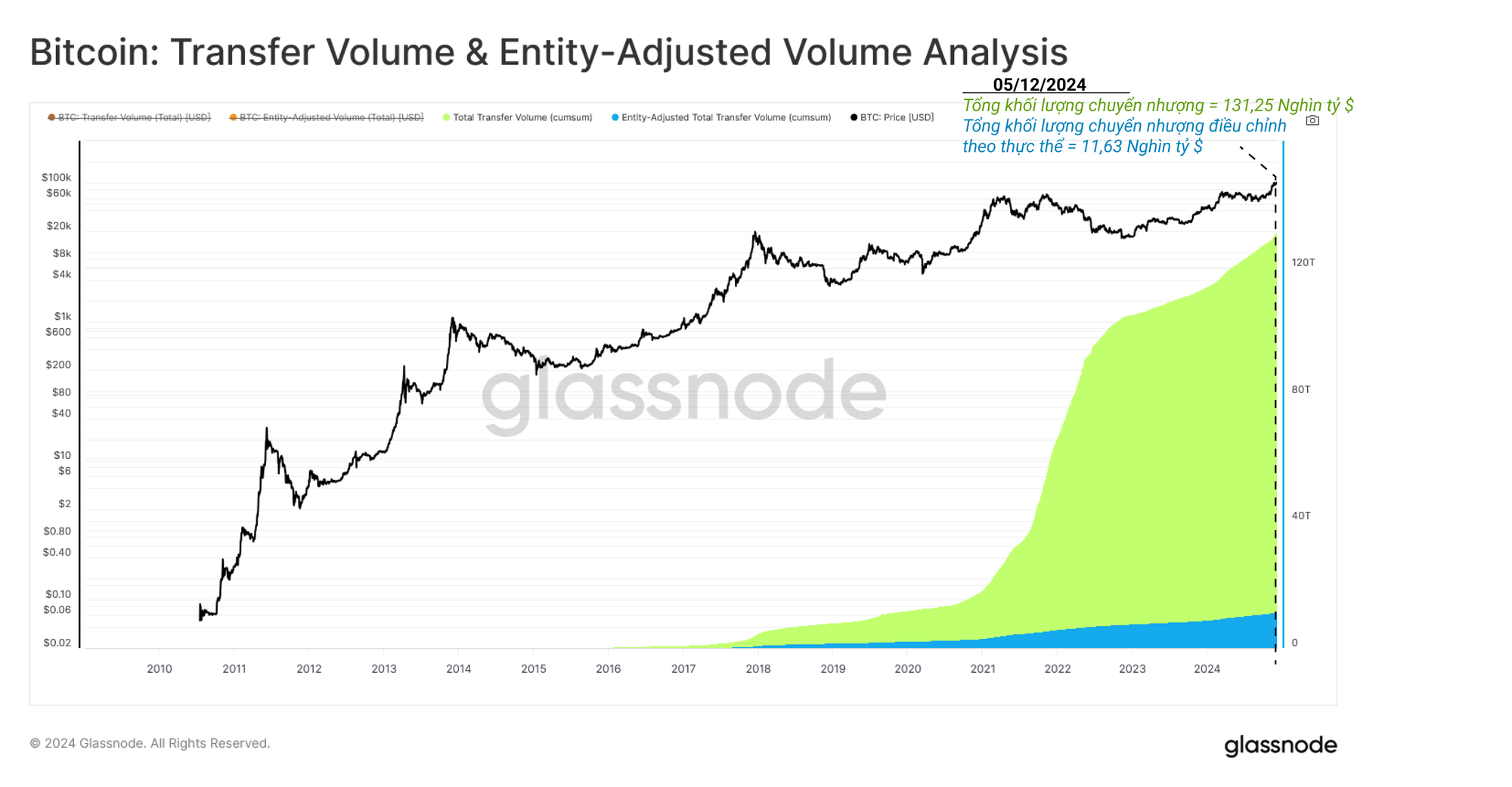 Đo lường giá trị USD của các giao dịch này tại thời điểm xác nhận, mạng lưới Bitcoin đã xử lý tích lũy 131,25 nghìn tỷ USD về khối lượng. Sau khi áp dụng điều chỉnh thực thể, khối lượng chuyển nhượng được lọc là 11,63 nghìn tỷ đô la, chỉ chiếm 8,86% tổng số.