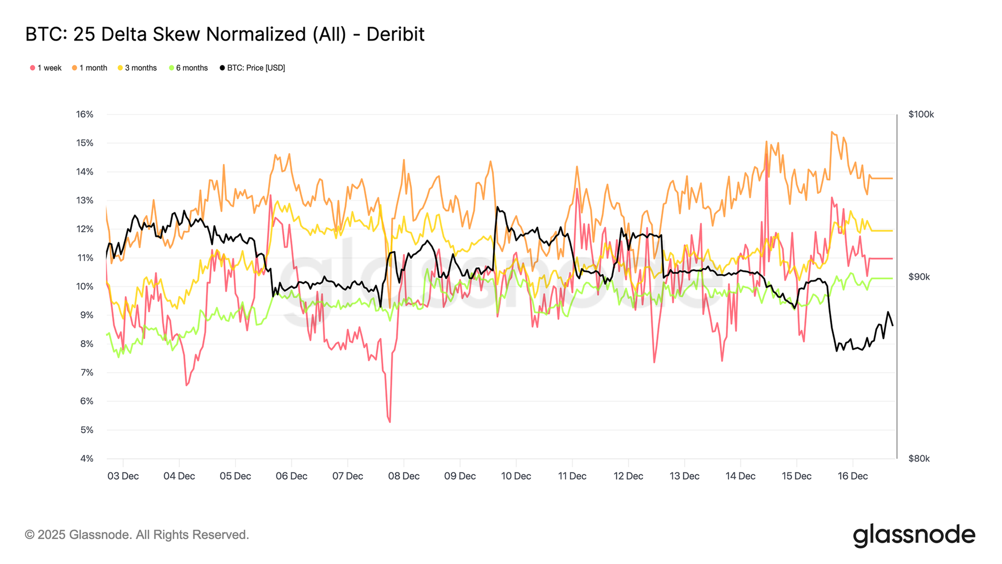 Bất chấp áp lực này, lực cầu kiên nhẫn cho đến nay vẫn bảo vệ được mức Trung bình Thực của Thị trường gần $81,3K, ngăn chặn một cú sập sâu hơn. Nhu cầu giao ngay vẫn mang tính chọn lọc, dòng tiền từ kho bạc doanh nghiệp ngắt quãng, và vị thế tương lai tiếp tục giảm thiểu rủi ro thay vì xây dựng lại niềm tin. Thị trường quyền chọn củng cố thêm chế độ đi ngang trong biên độ này, với biến động ngắn hạn bị nén lại, rủi ro giảm giá vẫn được định giá nhưng ổn định, và vị thế do đáo hạn đang ghìm chân hành động giá cho đến cuối tháng 12.