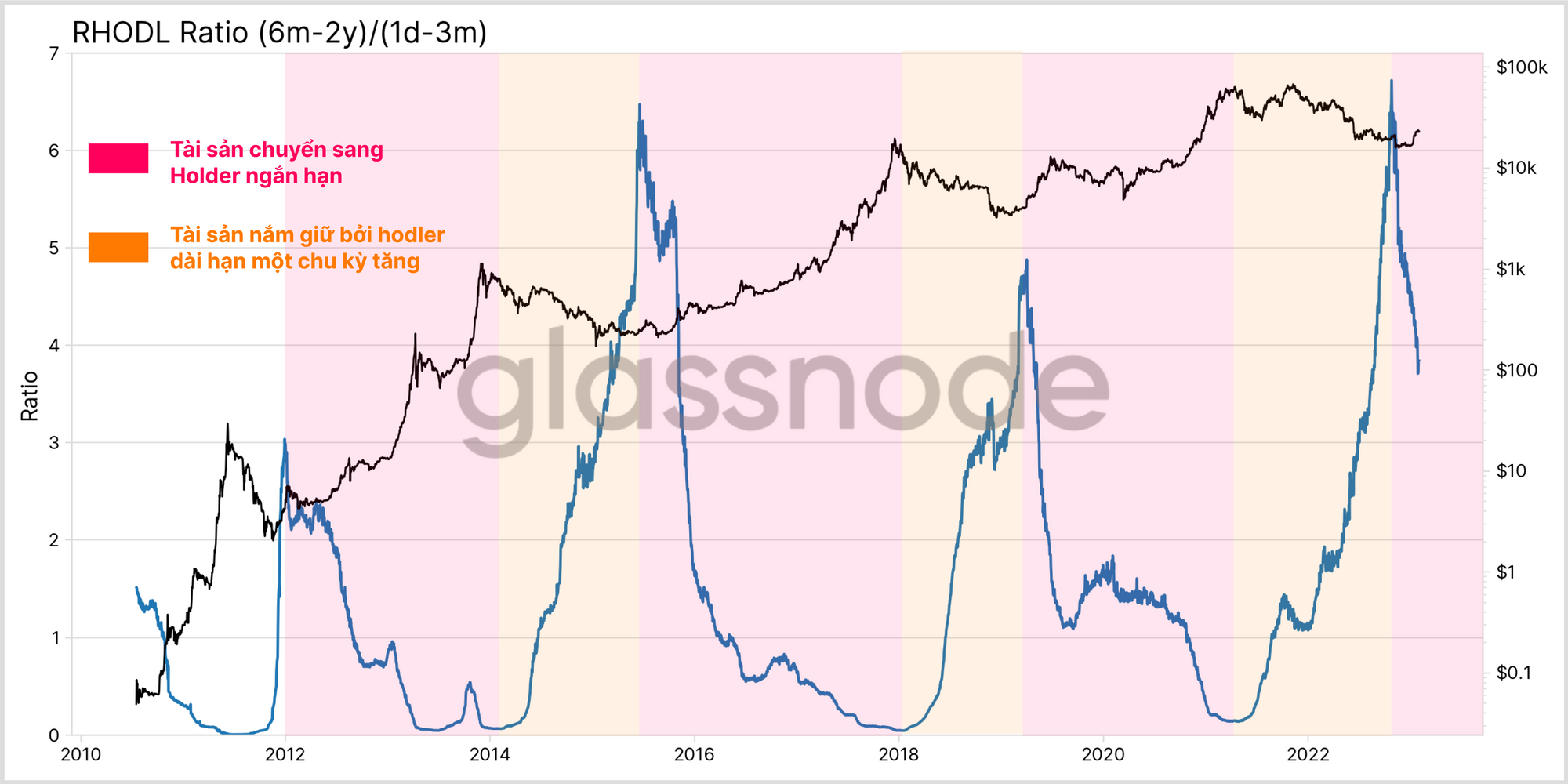 Với bối cảnh này, chúng tôi giới thiệu một biến thể mới của tỷ lệ RHODL, so sánh tài sản được nắm giữ bởi những Người nắm giữ dài hạn trong một chu kỳ (6 tháng-2 năm) với những Người nắm giữ ngắn hạn trẻ nhất (1 ngày-3 tháng). Điều này nhằm đánh giá bước ngoặt luân chuyển vốn qua sự chuyển đổi chu kỳ.
