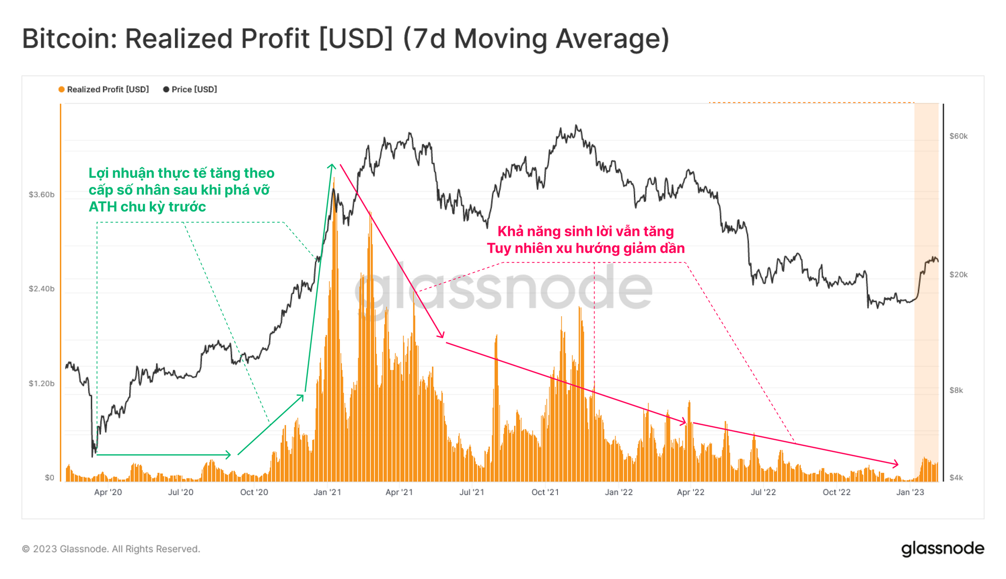 Chúng tôi sẽ bắt đầu đánh giá bằng cách phân tích lợi nhuận thực tế trong chu kỳ gần đây nhất. Chúng ta có thể thấy sự bùng nổ hoạt động chốt lời sau tháng 10 năm 2020 để đáp lại chính sách tiền tệ bất thường và giảm đi đáng kể kể từ mức cao nhất vào tháng 1 năm 2021, quá trình thanh lọc trong hai năm tiếp theo khiến thị trường trở lại mức của năm 2020.
