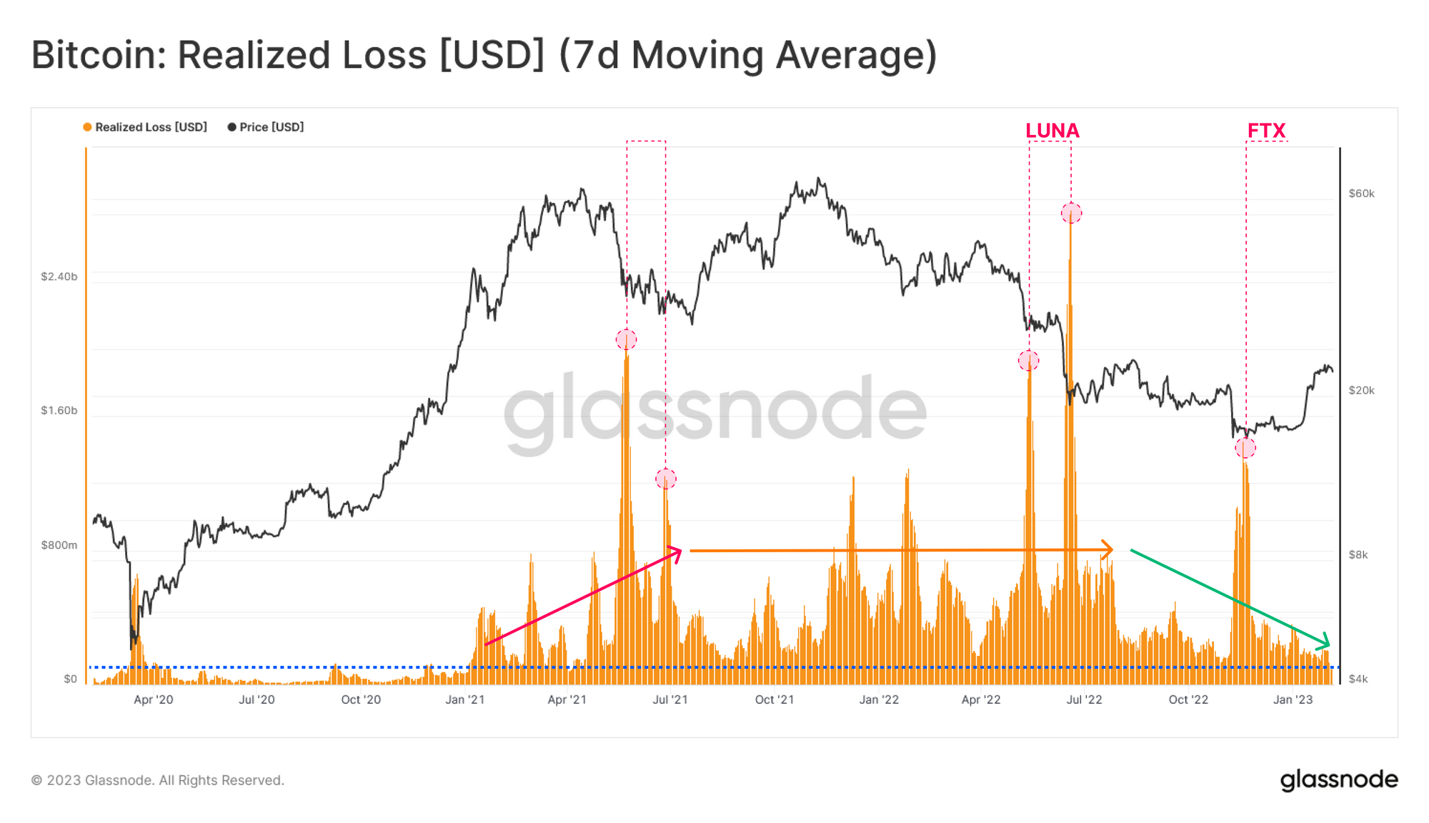 Tuy nhiên, có thể thấy rằng mức tổn thất thực tế hiện tại đã giảm xuống mức cơ sở của chu kỳ là khoảng 200 triệu đô/ngày, với mức tổn thất về tổng thể đã suy giảm ngoại trừ các sự kiện đầu hàng rõ ràng (ví dụ: LUNA / FTX).