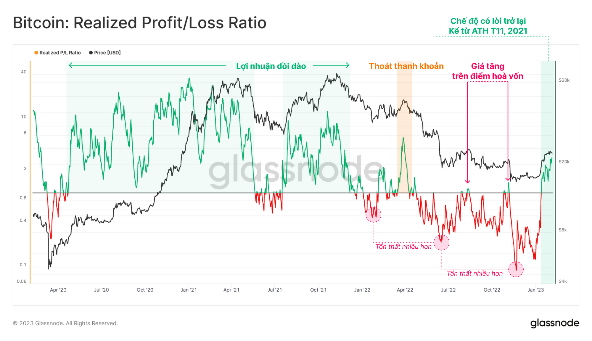 Xem xét tỷ lệ giữa Lãi và Lỗ thực tế, chúng ta có thể xác định những thay đổi cấu trúc trong sự thống trị giữa hai chỉ số này. Sau khi giá sụt giảm mạnh kể từ ATH tháng 11 năm 2021, thị trường bị chi phối bởi các khoản lỗ đã diễn ra sau đó, khiến Tỷ lệ P/L thực tế rớt xuống dưới 1, với mức độ nghiêm trọng ngày càng tăng sau mỗi đợt đầu hàng tiếp theo trong hành động giá.
