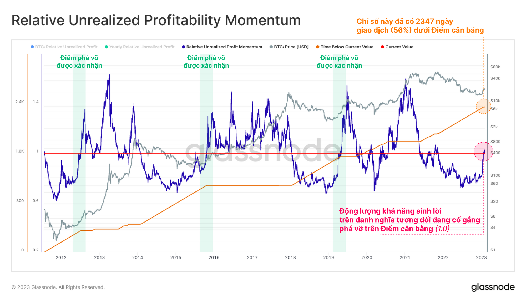 Trong lịch sử, các phá vỡ trên vị trí cân bằng này biểu thị sự chuyển đổi từ chế độ HODLing, sang chế độ chốt lời và luân chuyển vốn từ những người tích luỹ trong thị trường gấu đến các nhà đầu tư và nhà đầu cơ mới hơn.