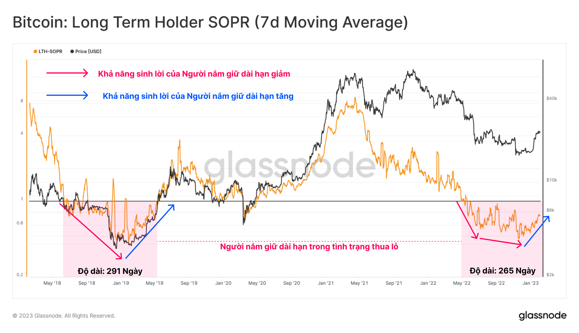 Đánh giá nhóm Người nắm giữ dài hạn, chúng ta có thể quan sát thấy tình trạng thua lỗ kéo dài dai dẳng kể từ khi LUNA sụp đổ. Mặc dù tiếp tục thua lỗ trong 9 tháng qua nhưng nhóm này đã có những dấu hiệu phục hồi ban đầu, với xu hướng tăng tiềm năng trong LTH-SOPR bắt đầu hình thành.