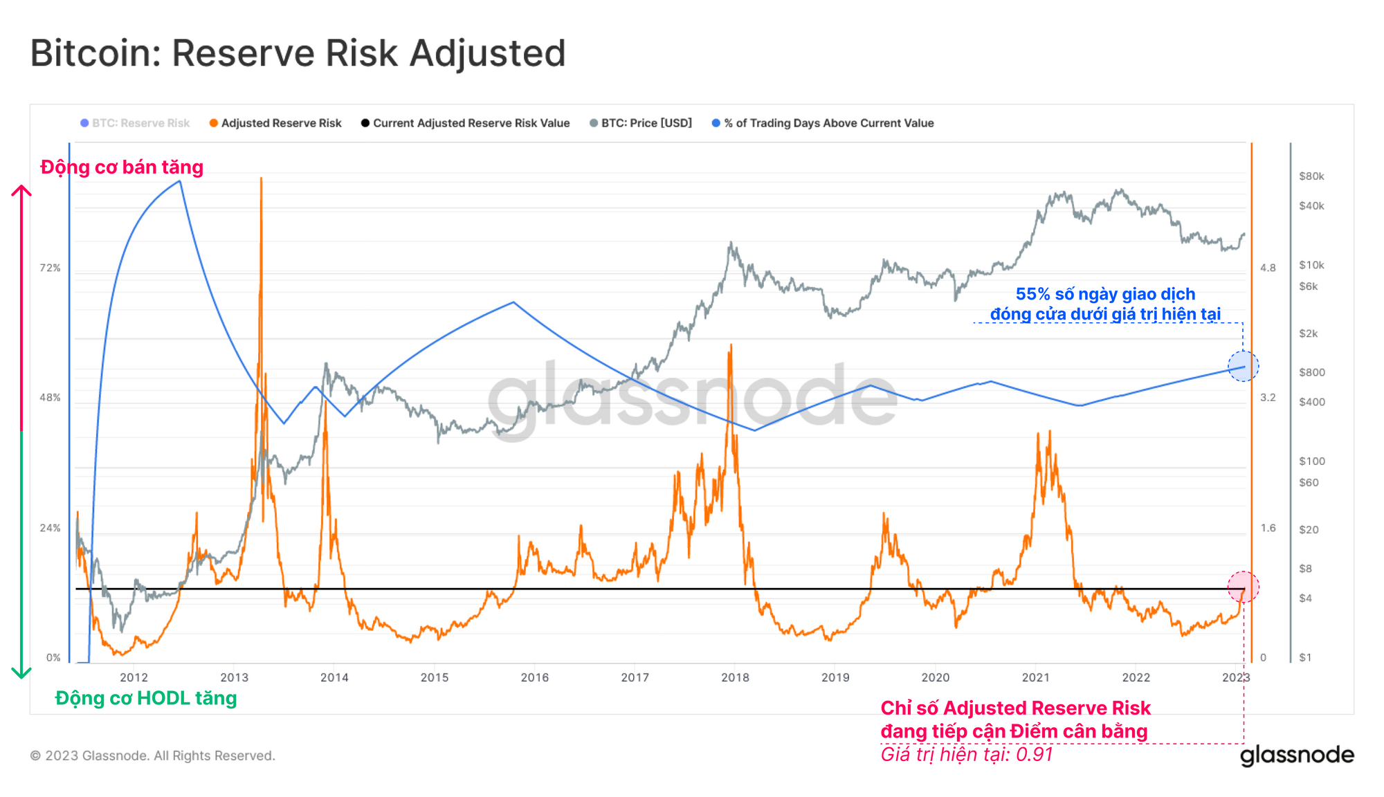 Chỉ báo Adjusted Reserve Risk có thể được sử dụng để bối cảnh hóa hành vi của nhóm HODLer. Chỉ báo này định lượng sự cân bằng giữa động cơ bán và chi tiêu thực tế của các BTC không hoạt động trong thời gian dài.