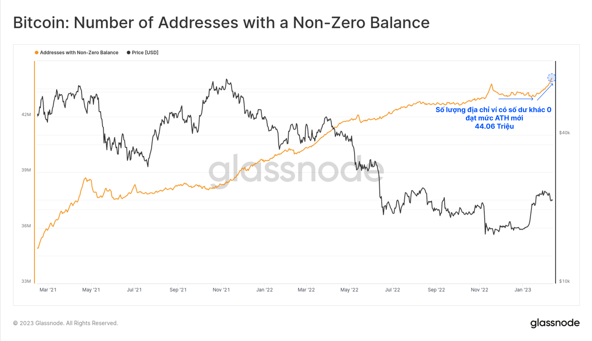 Tổng số địa chỉ ví có số dư khác không hiện đã đạt mức cao nhất mọi thời đại là 44.06 triệu địa chỉ, chứng tỏ rằng đã có một sự gia tăng ngắn hạn trong việc sử dụng mạng Bitcoin vào cuối năm, tuy nhiên điều đó không nhất thiết là do khối lượng BTC được di chuyển. Lý do chính của hiện tượng này là do người dùng sử dụng giao thức Ordinals khiến các block mang một lượng dữ liệu lớn hơn và người dùng mới thay vì chứa một khối lượng BTC lớn.