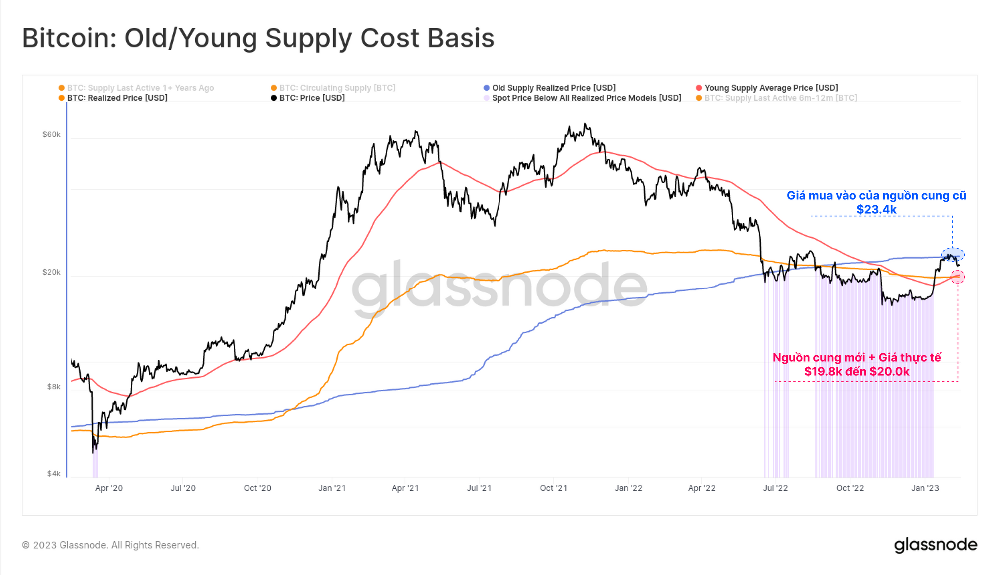 Nhìn chung, sau khi thị trường Bitcoin thoái lui khỏi một mức cực đoan (chẳng hạn như đỉnh hoặc đáy vĩ mô), hành vi của các nhà đầu tư hoạt động gần đây nhất có xu hướng trở thành yếu tố chi phối. Biểu đồ bên dưới cho thấy giá bị đình trệ gần giá mua vào của Nguồn cung cũ $23,400 (> 6 tháng 🔵) và cả Giá thực tế (🟠) lẫn Nguồn cung mới (< 6 tháng 🔴) đều ở dưới mức $19,800 đến $20,000.