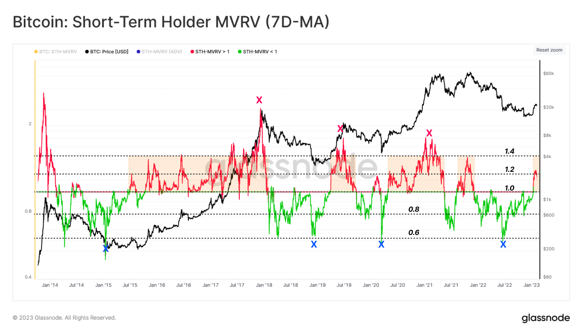 - Khả năng điều chỉnh ngắn hạn có xu hướng tăng trong các khoảng thời gian khi người nắm giữ ngắn hạn có lời +20% (STH-MVRV = 1,2) hoặc lỗ -20% (STH-MVRV = 0,8).