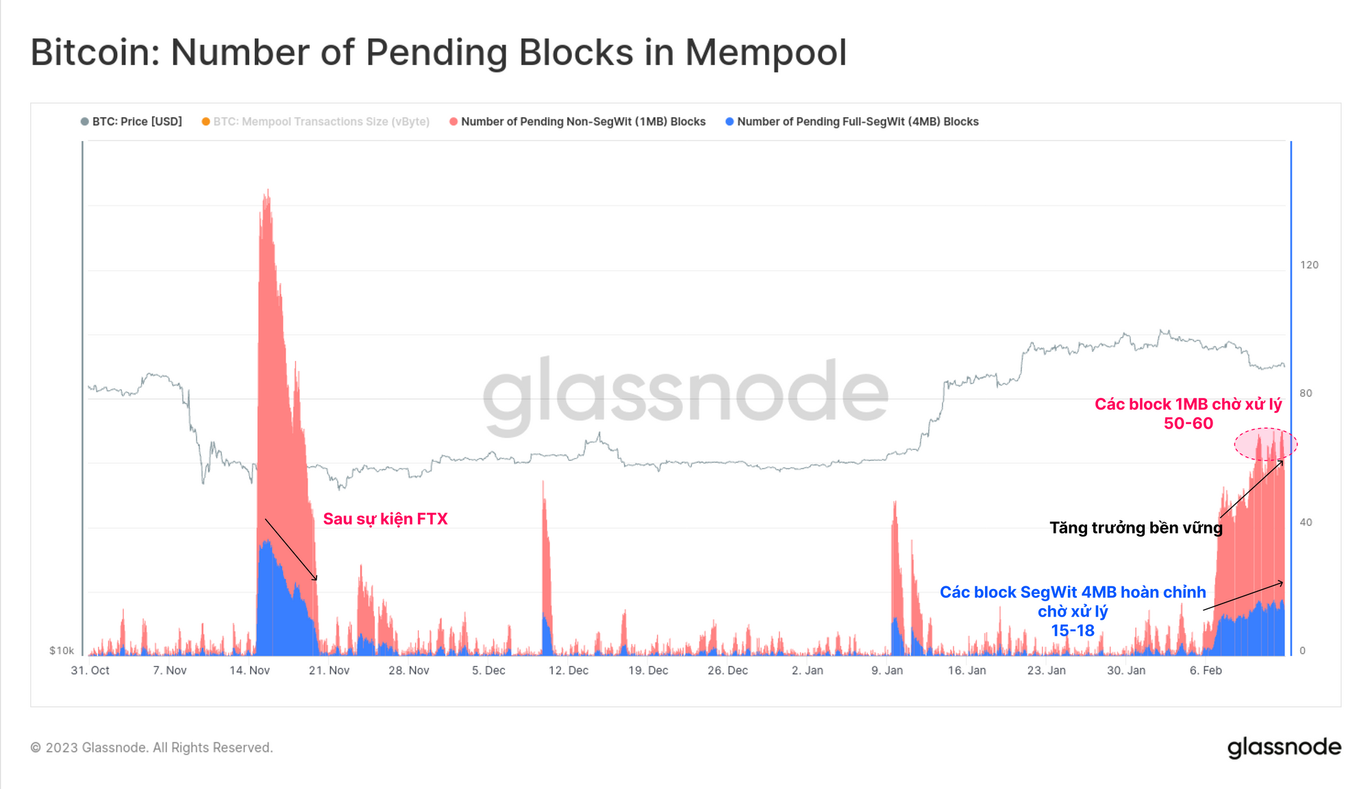 Chúng tôi cũng có thể lập mô hình số lượng khối đang chờ xử lý cần thiết để xóa khỏi mempool giả sử các giao dịch bao gồm non-SegWit tiêu chuẩn 1 MB 🔴 và các khối Seg-Wit 4 MB đầy đủ 🔵. Một lần nữa chúng ta có thể nhận thấy sự khác biệt đáng kể đối với giai đoạn hậu FTX, giai đoạn chứng kiến sự sụt giảm nhanh chóng. Với xu hướng Ordinals, chúng ta có thể thấy nhu cầu ngày càng tăng đối với không gian khối, đã được duy trì trong tuần qua.