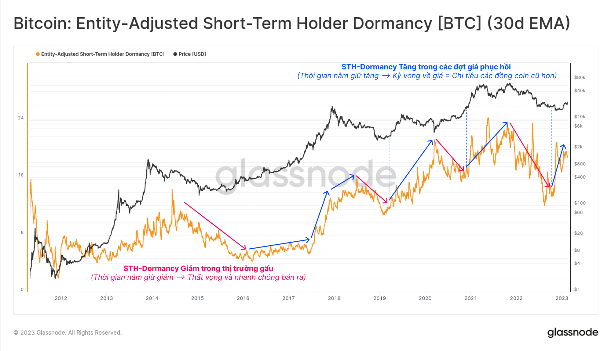 Đối với Nhóm người nắm giữ ngắn hạn (STH), chúng tôi có thể kiểm tra các kiểu hành vi chủ đạo của họ trong suốt các chu kỳ thị trường bằng cách sử dụng biến thể Dormancy mới được phát hành của chúng tôi. STH Dormancy phản ánh độ tuổi trung bình (tính bằng ngày) của số coin mà nhóm STH đã chi tiêu.