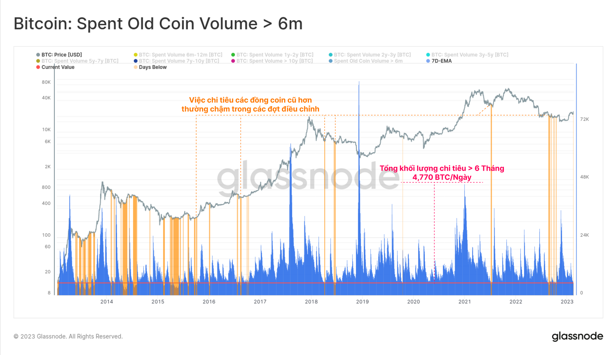 Chúng ta có thể thấy rằng các đồng coin cũ hơn cũng ở trạng thái không hoạt động tương tự, với ít hơn 4,770 BTC được di chuyển mỗi ngày trong tuần này. Biểu đồ dưới đây biểu thị các trường hợp trong quá khứ khi khối lượng BTC cũ cũng ở mức thấp này.