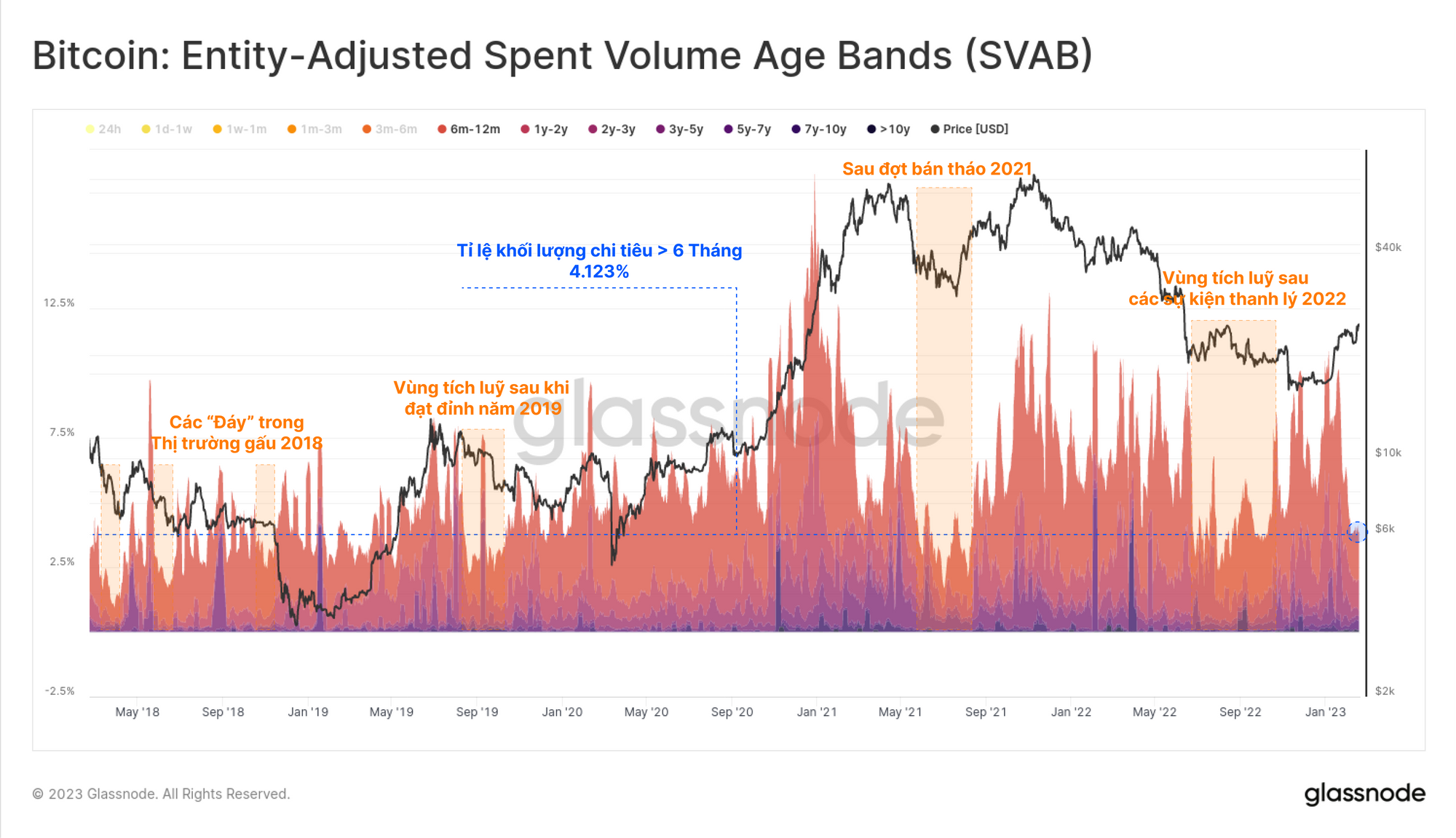Biến thể Entity-Adjusted củachỉ báo SVAB mới được chúng tôi phát hành gần đây cho thấy rằng chỉ 4.123% tổng khối lượng BTC đã chi tiêu là lớn hơn 6 tháng.Các giai đoạn quan trọng khi những người mua cũ hơn thể hiện xu hướng chi tiêu yếu hơn cũng xảy ra tương tự trong các đợt giá giảm của thị trường gấu trong suốt giai đoạn 2018 đến 2022.