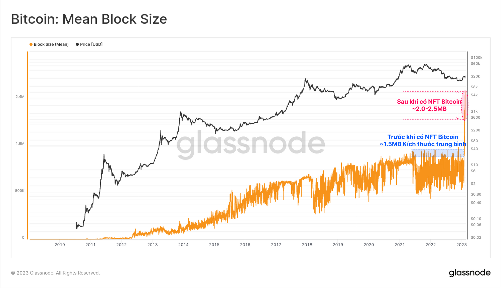 Kích thước khối trung bình cũng có sự thay đổi đáng kể, tăng từ mức thông thường 1.5 MB lên mức 2.0-2.5 MB hiện nay. Sự gia tăng kích thước khối trung bình này chủ yếu là kết quả của việc tạo ra các NFT Bitcoin với nhiều dữ liệu hơn được đưa vào trong phần nhân chứng của giao dịch.