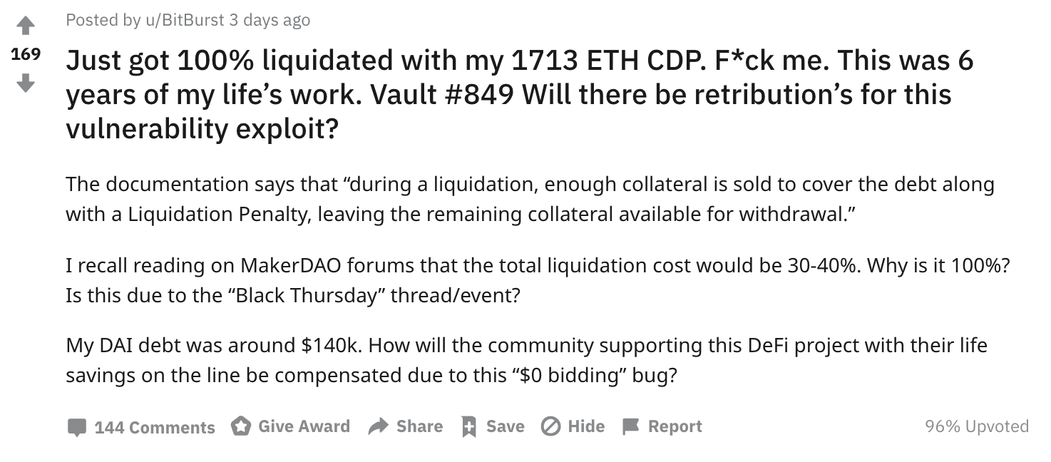 As u/BitBurst noted, many MakerDAO users lost their life savings. The largest liquidated CDP lost around 35,000 ETH, equivalent to ~$4 million USD at current prices. Community members are calling for MakerDAO to rectify the situation.