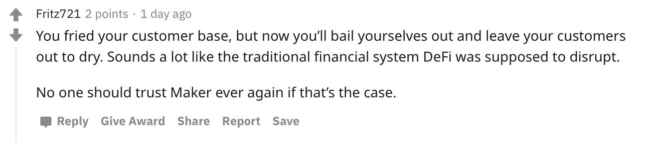 Other community members have pointed out the irony of Maker's response to the event, stating that it "sounds a lot like the traditional system DeFi was supposed to disrupt."