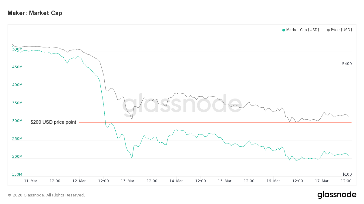 The price of MKR a month ago was over $600, whereas since the crash, it has sat at slightly over $200 USD.